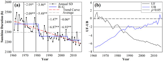 (a) Variation of annual SD and (b) the result of the Mann–Kendall test in mainland China during 1961–2016 (* refers to percent changes in annual SD from the preceding to the succeeding decade, and ** pronounces percent changes in annual SD from the 1960s to the respective decade).