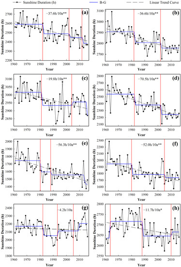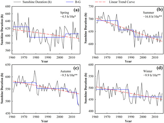 Over the past half century, there was a general decline in SD in the United States [20,21], Japan [22], Europe [23,24] and China [25,26,27]. The decline has also occurred over much of China, especially in northern and southeastern China as well as the Yangtze River Delta [28]. SD decreases at the highest rate in summer, followed by winter, autumn and spring [15,29]. Moreover, an evident mutation in SD was detected around 1980 in the Wei River Basin [30] and Tibet Plateau [31].