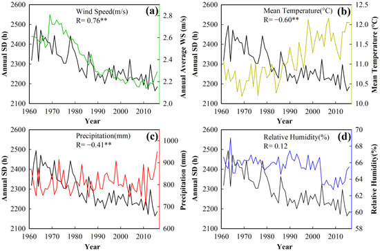 Figure 7 shows the relationship of annual SD with wind speed, mean temperature, precipitation and relative humidity. Wind speed presented a declining trend that may be due to the increased human buildings or global-scale warming [55,56], which was similar to that of annual SD, with a tendency rate of −0.11 m/s per decades. Annual SD showed a significantly positive correlation with wind speed (R = 0.76, p < 0.01). It is obvious that the annual average temperature displayed an upward trend, with the rate of 0.27 °C/10a, contrary to the variation of SD. Similar conclusions have been drawn by Ren et al. [57] and Yang et al. [58]. Therefore, annual SD was significantly negatively correlated with annual average temperature (R = −0.60, p < 0.01). In addition, annual SD decreased as precipitation increased with a trend rate of 4.41 mm/10a, and it was also significantly negatively correlated with precipitation (R = −0.41, p < 0.01). Relative humidity showed a slight decline trend (−0.43%/10a); however, there was no significantly positive correlation between annual SD and relative humidity (R = 0.12, p > 0.1).