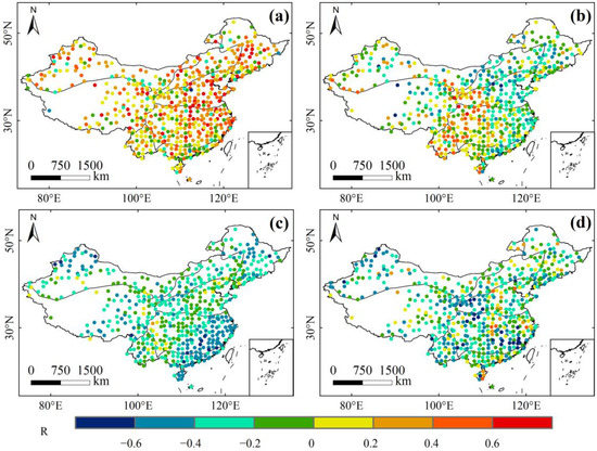 Figure 8 shows the correlation between annual SD and the meteorological elements at each station. Stations with positive correlation between annual SD and wind speed accounted for a large proportion in all parts of China. Among them, the correlation between annual SD and wind speed was the most significant in the eastern region. In CD region, annual SD was positively correlated with temperature. Nevertheless, the negative correlation between them increased gradually from southeast to northwest. In addition, the negative correlation between annual SD and precipitation was the most obvious in southeastern China, exhibiting a high–low–high spatial pattern from southeast to northwest. Noticeably, the negative correlation between annual SD and relative humidity in Southwest China and Northwest China was the most obvious.