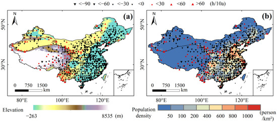 Elevation not only affects the distribution of SD in China, but also has an obvious influence on the change of SD (Figure 9a). The number of stations with an upward trend in annual SD was significantly larger in western and southwest China with higher terrain than that in the eastern region. To further explain this phenomenon, the variation in annual SD was compared with the population density of China in 2015 (Figure 9b). It is clear that larger decline in annual SD generally occurred in the eastern part of mainland China with lower altitude and higher population density. On the contrary, stations exhibiting increasing trends were usually found in higher altitude areas with lower population density. Similar conclusions have been drawn by Alpert et al. [59].