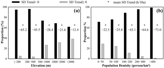 Relationship between variation trend of annual SD and (a) elevations; (b) population density.