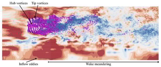 The dynamics of wake meandering is complex and its emergence can be attributed to two mechanisms: (1) forcing by large eddies in the atmospheric turbulence advected downwind as passive scalars; and (2) shear layer instability similar to the vortex shedding behind bluff bodies. The first mechanism seems to be more prevalent at field scale [14], while the second mechanism is often observed at laboratory scale [59]. Recent experimental and computational studies [70,71], on the other hand, suggest the coexistence of the two mechanisms at utility scale. Wake meandering is characterized by, among others, its frequency, amplitudes, and wavelength. The Strouhal number of the meandering frequency is found to be in a range (about 0.1–0.4) independent of the Reynolds number [71]. The amplitudes of meandering are found to grow in the downwind direction [76]. In wind farms, the meandering amplitudes are found to be larger for the turbines at downwind locations [67,75]. The wavelength is in the order of rotor diameter, as shown in [64,65,66].