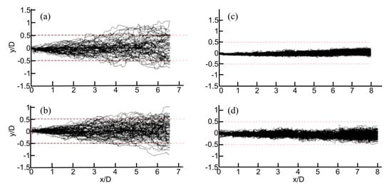 Wind tunnel experiments that examine the effects of large-scale eddies on wake meandering. The figure shows the wake centerline paths in the wake of a porous disk (axial induction factor ): (a,b) under atmospheric turbulence with the integral length scale 7.5–10 times greater than the disk diameter; and (c,d) under isotropic turbulence with the integral length scale 3–10 times smaller than the disk diameter. The hub heights corresponding to the full scale are 40 m and 140 m for (a,b), respectively. The turbulence intensity of the downwind component is 3% and 12% for (c,d), respectively. Reproduced from [57]. Reprinted with permission.