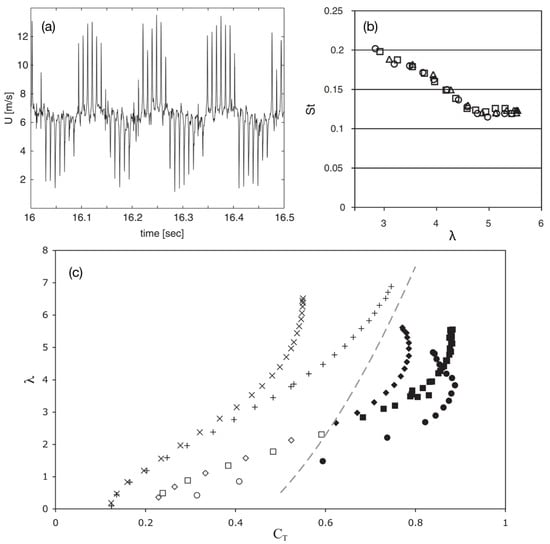 Wind tunnel experiments that support the hypothesis that wake meandering is caused by shear layer instability similar to the vortex shedding of bluff bodies. (a) Time signal of the downwind velocity close to the centre of the tip vortices at 1D turbine downwind. (b) Strouhal number as a function of the tip speed ratio . ∘: m/s, no turbulence; □: m/s, 4.5% grid turbulence; ▵: m/s, no turbulence. (c) Thrust coefficient as function of the tip–speed ratio. +: 1 blade, pitch = ; ×: 1 blade, pitch = ; ◽, ◾: 2 blade, pitch = ; ⬥: 2 blade, pitch = ; : 3 blade, pitch = . Meandering was not observed for the turbines with one blade. Filled symbols indicate the existence of wake meandering. Reproduced from [10,59]. Reprinted with permission.