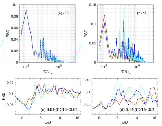 The coexistence of the two mechanisms for the low frequency motions of turbine wakes. The figure shows the results from LES of a utility-scale turbine under the inflow with large-scale eddies. (a,b) Power spectral density (PSD) profiles from cases of different tip–speed ratios at different downwind locations. (c,d) Downwind variations of the maximum PSD and the corresponding frequency in two regions of different ranges of frequency for: (c) ; and (d) . The PSD is computed using the spanwise velocity fluctuations at different downwind locations along the rotor centerline. Red solid line: ; green dashed line: ; blue dash-dot line: ; and cyan dotted line: . Reproduced from [70]. Reprinted with permission.
