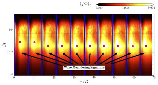 The existence of similar wake meandering frequency in a wind farm. Large-eddy simulation of the Horns Rev wind farm. The figure shows the contours of the row-averaged pre-multiplied power spectral density as a function of the downwind distance and Strouhal number. Vertical blue lines delineate the axial location of each wind turbine. Annotations refer to the region of high PSD that is associated with wake meandering and the circles mark the maximum PSD in the wake meandering region in each corresponding turbine. Reproduced from [67]. Reprinted with permission.