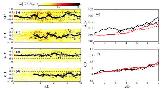 Wake meandering characteristics for different turbine operational regimes. Instantaneous vorticity magnitude, , with velocity minima (dot) and meander profile (line) for: (a) Region 2, actuator surfaces models for both blades and nacelle (R2-BN); (b) Region 2, actuator surfaces models for blades only (R2-B); (c) Region 3, actuator surfaces models for both blades and nacelle (R3-BN); and (d) Region 3, actuator surfaces models for blades only (R3-B). Average meander profile (e) amplitude (A) and (f) wavelength () with respect to distance from rotor plane, x/D, nondimensionalized by the diameter D. Black solid lines: R2-BN; black dashed line: R2-B; red solid lines: R3-BN; and red dashed line: R3-B. Reproduced from [66]. Reprinted with permission.