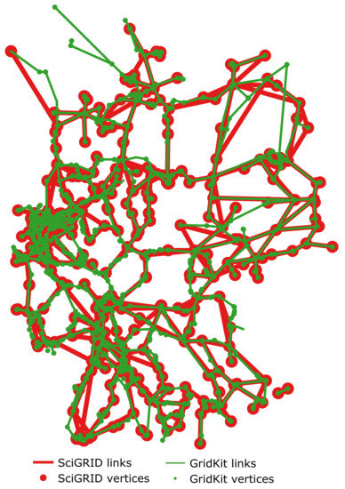 - Matke, C.; Medjroubi, W.; Kleinhans, D.; Sager, S. Structure Analysis of the German Transmission Network Using the Open Source Model SciGRID. In Advances in Energy System Optimization, Proceedings of the First International Symposium on Energy System Optimization (ISESO 2015), Heidelberg, Germany, 9–10 November 2015; Springer: Berlin, Germany, 2017; pp. 177–188. [Google Scholar]