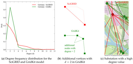 The frequency peak for the GridKit model is at a degree value of , while for the SciGRID model the peak is at . This difference is caused by the creation of the auxiliary vertices in the GridKit model, which have a degree of two, as depicted in Figure 2b. The maximum degree value in the GridKit model is 10, whereas there are also vertices with a degree value of , and in the SciGRID model. This difference can be explained by the higher degree of abstraction of the SciGRID model and is demonstrated exemplary in Figure 2c for the substation at the nuclear power station in the Emsland region in Germany (the degree values are indicated by the numbers in the circles). While the substation is abstracted by one vertex with in the SciGRID model, it is represented by multiple vertices with lower degree values in the GridKit model.