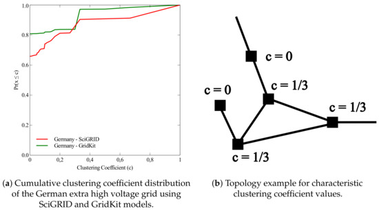 Furthermore, Figure 5a shows that the share of vertices with a clustering coefficient of zero is larger in the GridKit dataset than in the SciGRID dataset. This is due to the lower degree of abstraction of GridKit and the presence of the auxiliary nodes which have a clustering coefficient of zero (belonging to the second group as defined above). Note that in both models, a high share of vertices has a clustering coefficient of . This is mainly caused by vertices forming triangles inside the network as shown in Figure 5b. The vertices, which are connected to the triangle and one other branch, have a clustering coefficient of , because they have three pairs of neighbours, of which one is connected. In the GridKit data the share of vertices with a clustering coefficient of is about 5 percentage points higher than in the SciGRID grid, because additional triangles are introduced at the intersections of the power lines.