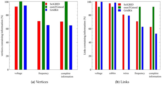The results for the links are shown in Figure 6b. For both the information on the voltage and the number of cables per transmission line, SciGRID and GridKit have a higher completeness than osmTGmod. Considering the frequency information, the osmTGmod model is most complete. The completeness of the information on the number of wires per transmission cable is approx. for SciGRID and GridKit. For osmTGmod, no value is given in Figure 6b, because the information on the wires was not directly obtained from OSM. Instead, in osmTGmod it is assumed that all 220 kV transmission lines have two wires per cable and all 380 kV lines have four wires per cable [35]. Links having overall complete information account for in osmTGmod, in SciGRID and in GridKit.