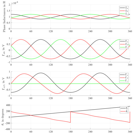 where , , and fluctuate in function of twice the rotor position. In this example, mutual inductances are ignored for simplicity. Nevertheless, this case corresponds to a class of tooth-wounded permanent magnet synchronous machines in certain combinations of poles and stator teeth, thus it refers to a real case. In Figure 5, the simulated self-inductances are shown with H and H. The and are then shown in the case of an inverter bus voltage V as well as the reconstructed rotor position . It has to be remarked that the signals of and of are not purely sinusoidal. In fact, such signals are obtained via the adjoint matrix of , which is a matrix whose elements are obtained by multiplying the phase inductances. Thus, although the inductance matrix is made of purely sinusoidal terms representing a second harmonic with respect to the electrical angle, its adjoint matrix and, therefore, the signals in the vectors present a fourth harmonic component, with different phase shifts in the and frames. The reconstructed rotor position has a phase shift of , moves in the opposite direction, and at twice the frequency of the rotor position. Nevertheless, compensation is trivial and further details concerning the extraction of the machine flux angle can be found in [17].