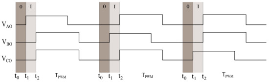 As discussed in the previous section, measuring the voltage in the two excitation states of the machine shown in Figure 3 can retrieve the quantities that contain information about the machine phase inductances. For this reason, a modified edge-aligned PWM is proposed as shown in Figure 6, where the machine is driven in the excitation states 0 and I at the beginning of each PWM time period allowing measurements of the voltage. In particular, the PWM time period starts at time . One phase is then switched on at the time instant and, finally, the driving excitation according to standard edge-aligned PWM starts at the time instant . During these two states of excitation, measurements can be performed. It is important to remark that the introduction in the PWM pattern of these two excitation states reduces the maximum applicable voltage to the machine. For this reason, it is of interest to reduce the time of injection of these two states.