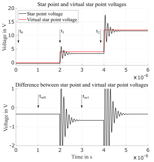 To measure , a straightforward method is to measure the voltage right before and after the switching between the machine excitations 0 and I. In this work, this measurement method is referred to as direct voltage measurement (DVM). Figure 7 shows the simulated response of , , and . As one can see, voltage oscillations are present, as described previously, due to the measuring impedance as well as to the parasitic capacitance. Measurements are performed at the generic time instants and , providing and . Ideally, it is preferable to choose and . Nevertheless, especially concerning the measurements performed at , it is important to wait for the oscillations to decay to reduce measurement disturbances. Also, oscillations depend strictly on the machine parameters as well as on the impedance connected at the star-point, thus leading in some cases to a significant time for the oscillations to decay and, therefore, reducing the maximum applicable voltage.