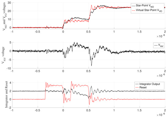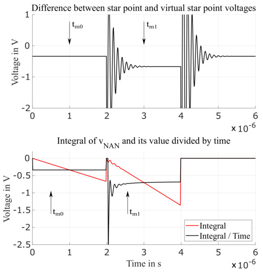 Another method to measure is the usage of a fast resettable integrator circuit (FRIC). This technique is based on measuring the integral of the voltage. An analog integrator connected to the machine star-point and to the virtual star-point is activated when the machine state of excitation 0 is injected, thus integrating the voltage during the time of the machine excitation. The integrator is then reset before the machine state of excitation I is provided. At the end of the application of this excitation state, the integrator is held in reset until the next PWM period. Figure 8 shows the integration applied to the voltage already presented in Figure 7. As one can see, the oscillation affecting the integrated voltage decays much faster than in the case of DVM, thus allowing a measurement to be performed earlier and, consequently, to reduce the injection time of the excitation necessary to obtain the quantities thus increasing the maximum applicable voltage. Let us define the quantities and as the measurements of the integral of at the time instants and , respectively. Let us also define the time intervals and . To obtain the quantities of interest, one can use the following equations: