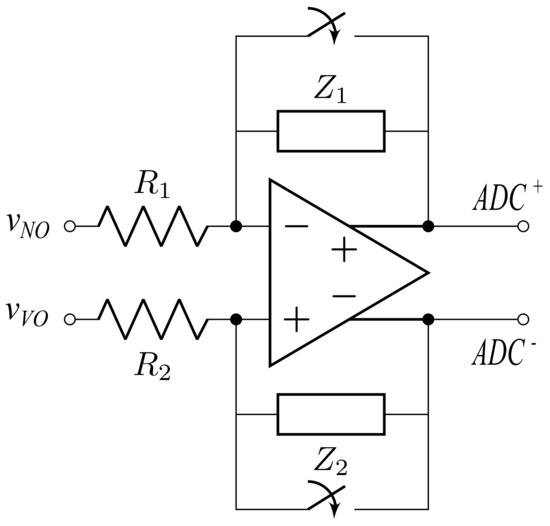 Measuring requires dedicated electronics. In Figure 9, an electronic schematic is proposed that can either be used for DVM or for FRIC, which is based on a differential operational amplifier and its output is a differential voltage. For DVM operation, the impedances Z are resistors. Also, the reset mechanism is not used. In particular, given and , this stage has a gain equal to . Such gain needs to be adjusted to provide a reliable measurement without bringing the measurement stage into saturation. When operating as a FRIC, the impedances and are capacitors. In this case, the stage is tuned by setting and by considering that the gain of the integrator stage is given by , where . In this case, the gain also needs to be adjusted to provide a measurement that does not drive the measuring stage into saturation. Moreover, the reset mechanism is used to mantain the integrator in reset when no measurement is performed. In this case, the feedback capacitors are shortcircuited and the output is zero.