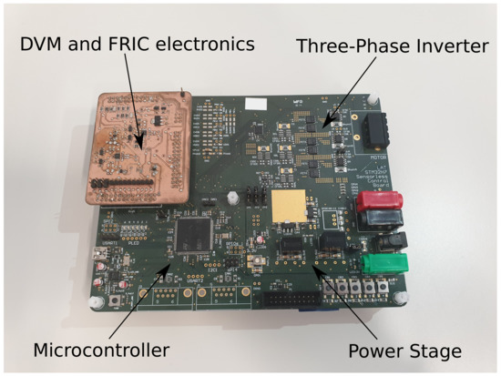 The PMSM has been coupled to a Baumer GBA2H 18 bit encoder and to a servomotor. An electronic board based on a 32-bit microcontroller, a three-phase MOSFET-based inverter, and dedicated electronics for implementing both the DVM and FRIC has been developed. The chosen microcontroller features 16-bit ADCs and a clock frequency of 400 MHz, which allows high timing precision in generating the required reset and sampling triggers of the FRIC circuitry. A dedicated USB based communication protocol is implemented to measure and record the obtained signals at high frequency. Figure 10 and Figure 11 show the experimental bench and the electronic board, respectively.