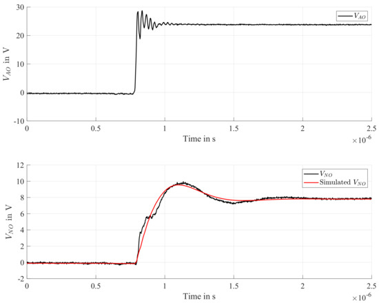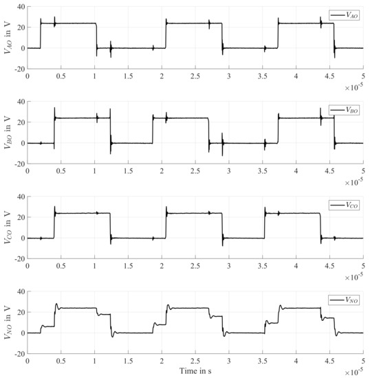 The three-phase inverter operates at a bus voltage of 24 V and is driven by means of the modified edge-aligned PWM pattern described earlier and shown in Figure 6. In Figure 12, the measured phase voltages and are shown. In this case, a duty cycle of 50% has been applied to all phases. To verify (30), the voltage has been measured during the transition of the machine from the excitation state 0 to the excitation state I, by switching the phase voltage to the inverter bus voltage and leaving and connected to ground. In fact, as shown previously, the transfer functions in (30) can be expressed as the series of an ideal transfer function representing the machine electrical behavior and a high-frequency transfer function modeling the presence of an impedance connected to the machine star-point, especially for the case of a parasitic capacitance in addition to a measuring circuit that, in this case, is given by the oscilloscope probe used for measuring . A linear transfer function with 3 poles and 1 zero (as predicted by the mathematical derivation proposed earlier) has been identified by means of a nonlinear least-squares algorithm to approximate the star-point voltage response. This procedure has retrieved an adherence between the measured and the simulated responses of 93.84%, and results are shown in Figure 13, where the voltages , , and the output of the simulated model are shown. It has to be remarked that the proposed mathematical model does not take into account the presence of eddy currents.