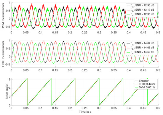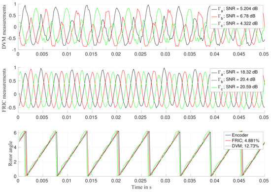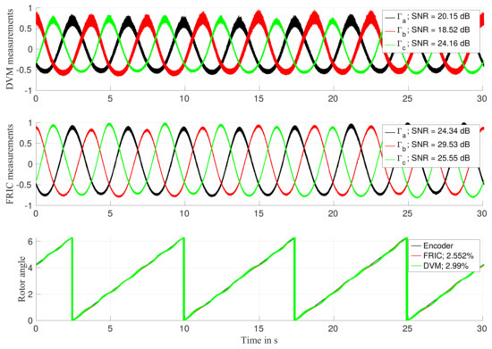 The signal-to-noise ratio (SNR) has been evaluated per each measured signal. Given that is composed of non purely sinusoidal signals, the SNR has been evaluated by calculating the fundamental frequency and by considering all harmonics beyond the 5th one as noise. As one can see, the measured exhibits higher SNR when the FRIC approach is used. The reconstructed position is then compared to the position given by the encoder. In this case, the percentage error has been evaluated. In this case, FRIC has provided a maximum position error of while DVM provides a maximum position error of . One can also observe that the signals obtained by applying DVM or FRIC are similar but not equal as the FRIC method introduces a deviation from the reference value as discussed earlier.