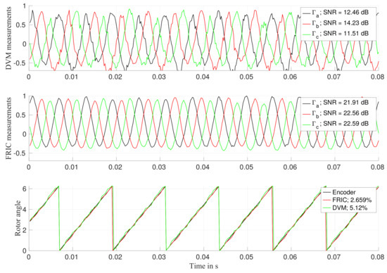 Experimental investigations have been conducted under two scenarios. Firstly, the PMSM has been coupled to a servomotor that is used to impose a rotation of 1 revolution per minute (RPM) to the PMSM to measure by means of DVM and FRIC in almost standstill conditions. The PMSM has been driven at zero current condition by driving all phases at duty cycle. Figure 15 shows the obtained results, where the signals have been normalized.