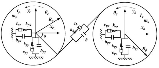 Figure 1 shows the six-degrees-of-freedom bending-torsion coupled model of the gear-rotor-bearing. The specific vibration form of the drive shaft is not considered. yp, xp and θp represent the vertical displacement, transverse displacement and torsional displacement of the driving gear, yg, xg and θg represent the vertical displacement, transverse displacement and torsional displacement of the driven gear. The subscripts p and g represent driving gear and driven gear, respectively. Other parameters are listed in Table 1. The gear mesh is described by a non-linear displacement function and viscous damping. The friction force at the mesh point is assumed to be negligible. Further, it is assumed that input torque and output torque are constant.