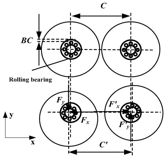 BC indicates bearing clearance. C is the theoretical center distance and C′ is the center distance which considering the influence of the bearing clearance. Fx and Fy represent the contact force in X-direction and Y-direction on driving gear, respectively. F′x and F′y represent the contact force in X-direction and Y-direction on driven gear, respectively.