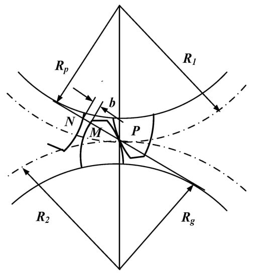 The backlash is used to describe the gap of the teeth along the mesh line. Theoretically, the backlash is 0. However, due to the need of lubrication and manufacture errors, there will be a backlash between the conjugate teeth pair, we define this gap as the initial backlash b0. Actually, the change in the gear center distance will cause a corresponding change in the backlash. As we all know, the backlash is a nonlinear factor affecting the dynamic behavior of the system. So, the relationship between the center distance and the backlash is particularly important. Figure 5 is the model of the center distance and backlash. The P is the mesh point. R1 and R2 are pitch circle.