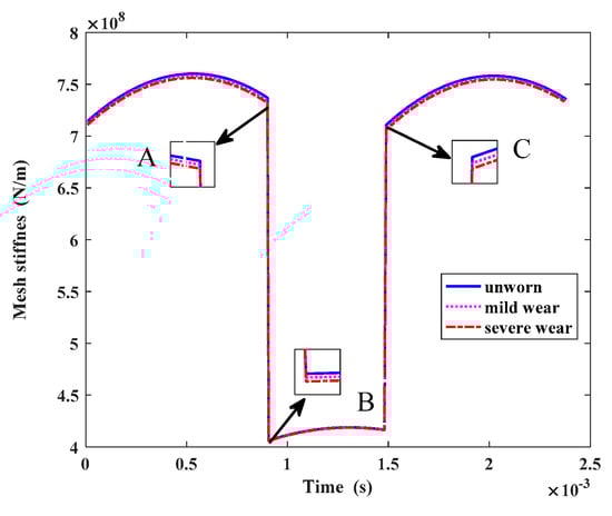 The horizontal axis represents time and the vertical axis represents the mesh stiffness value. Figure 6 shows the meshing stiffness of gears in a cycle under different bearing clearances. In Figure 6, A and C represent the double tooth mesh area respectively, and B represents the single tooth mesh area. Overall, the increase of the tooth surface wear depth reduces the mesh stiffness. At the beginning of the A-segment (double-tooth mesh area near the tooth tip), the change of the tooth mesh stiffness is most obvious under the different wear depths. From the A-segment to the B-segment (single-tooth mesh area near the pitch point), the change of tooth mesh stiffness gradually becomes weak under the different wear depths. From the B-segment to the C-segment (double-tooth mesh area near the tooth root), the change of the tooth mesh stiffness gradually becomes apparent under the different wear depths, which is consistent with the reference []. The reason for this may be because the wear depth of the single-tooth mesh area is tiny during the gear mesh process, which is much smaller than the wear depth of the double-tooth mesh area, so the stiffness does not change significantly in the single-tooth mesh area.