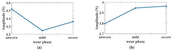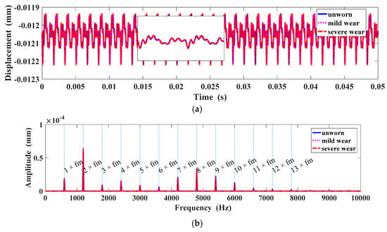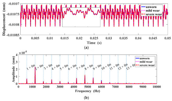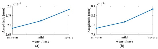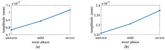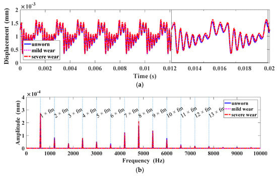 Figure 11a depicted the relative displacement under different wear phases. The amplitude of the relative displacement will be enlarged slightly with the increase of wear depth. The spectrum of relative displacement is shown in Figure 11b. To investigate the variation of the relative displacement, the first four harmonics of the meshing frequency are illustrated in Figure 12. As can be seen, the first order, second order and fourth order harmonics are enlarged with the increase of the wear depth. However, the third harmonic is descending for the wear phases from unworn to mild wear, and then increasing for the wear phases from mild wear to severe wear.