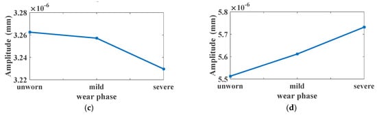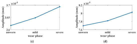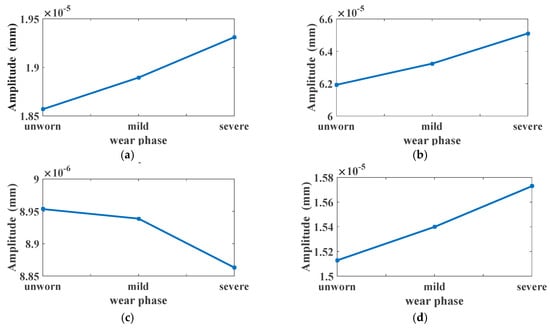 Harmonics of relative displacement spectrum under different wear phases: (a) 1 × fm at 40 Nm; (b) 2 × fm at 40 Nm; (c) 3 × fm at 40 Nm; (d) 4 × fm at 40 Nm.