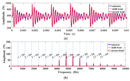 Gear meshing force under different wear phases: (a) Gear meshing force; (b) Spectrum of gear meshing force.