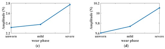 Harmonics of gear meshing force under different wear phases: (a) 1 × fm at 40 Nm; (b) 2 × fm at 40 Nm; (c) 3 × fm at 40 Nm; (d) 4 × fm at 40 Nm.