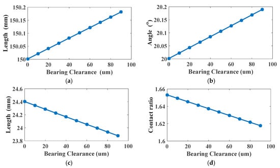 Figure 15 depicted the variation of gear parameters under different bearing clearances. With the increase of the bearing clearance, the actual gear center distance will increase linearly, as shown in Figure 15a. Due to the change of the gear center distance, the gear pitch circle will be increased; however, the base circle and addendum circle will remain unchanged, as these circle are machined dimensions. The pressure angle is related to the base circle and pitch circle, and the contact line length is related to the pitch circle and addendum circle. Figure 15b,c shown the variation of the pressure angle and contact line length under different bearing clearances. The reduction of the contact line length causes the decrease in contact ratio as shown in Figure 15d. The greater the contact ratio, the more stable the gear system runs.