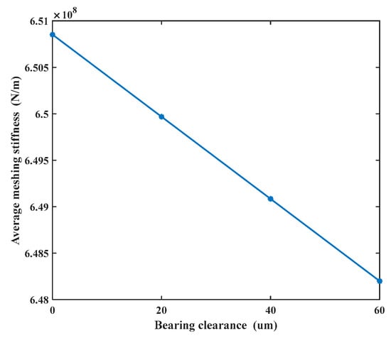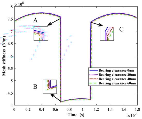 Gear time-varying meshing stiffness is an important factor affecting the dynamics of gear system. The change of the bearing clearance leads to the shift of gear meshing position, which further leads to the change of gear meshing stiffness. Figure 16 shows the meshing stiffness of gears in a cycle under different bearing clearances. In Figure 17, A and C represent the double tooth mesh area respectively, and B represents the single tooth mesh area. The time-varying meshing stiffness will increase gradually with the increase of bearing clearance. At the same time, in the zoomed-in figure we can see that the double tooth mesh area was reduced, and the single tooth mesh area increased. The reason for this is that the increase of bearing clearance leads to the decrease of contact ratio, which means that the double tooth mesh area is reduced. In order to explain the change of meshing stiffness of gears with bearing clearance more clearly, the average meshing stiffness of gears in a period with different clearance is calculated as shown in Figure 17. It can be seen that the average meshing stiffness decreases linearly with the increase of bearing clearance.