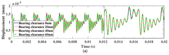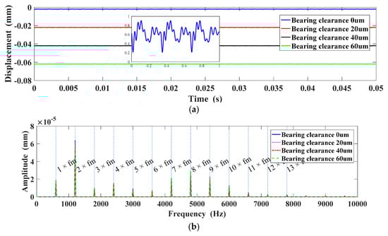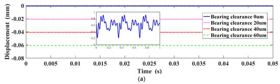Figure 18a depicted the Y-displacement under different bearing clearances. The larger the bearing clearance is, the more shift is generated. More detail on displacement in time domain is depicted in the zoomed-in figure. The spectrum of Y-displacement is shown in Figure 18b. The first four harmonics of the Y-displacement are illustrated in Figure 19. As can be seen, the first order harmonic and second order harmonic are enlarged with the increase of the wear depth and change linearly. The third order harmonic is linearly descending. However, the fourth harmonic presents a nonlinear tendency with the increase of bearing clearance.