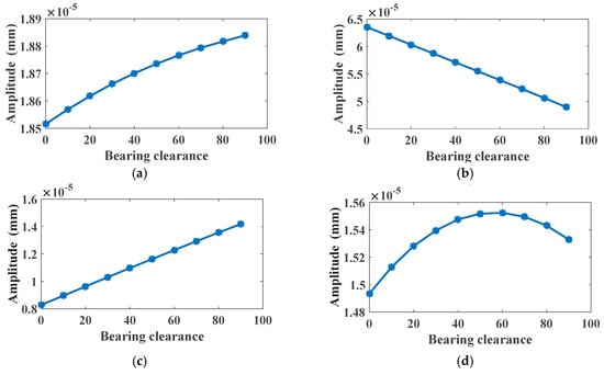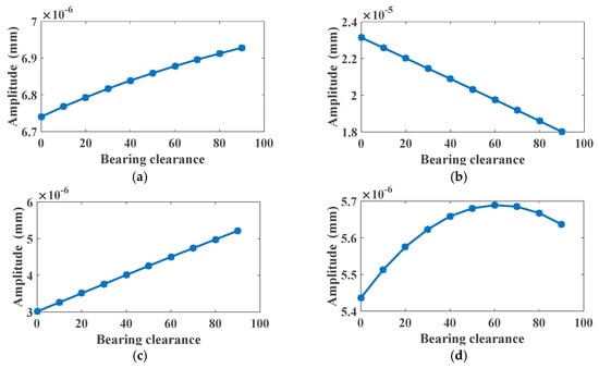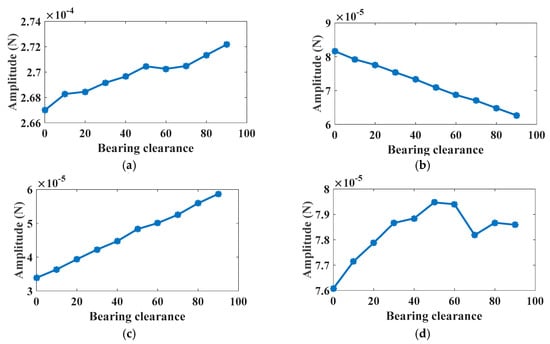 Harmonics of mesh frequency in Y-displacement spectrum under different bearing clearances: (a) 1 × fm at 40 Nm; (b) 2 × fm at 40 Nm; (c) 3 × fm at 40 Nm; (d) 4 × fm at 40 Nm.