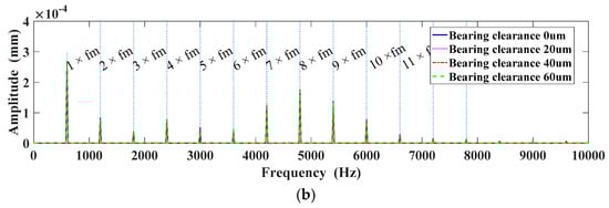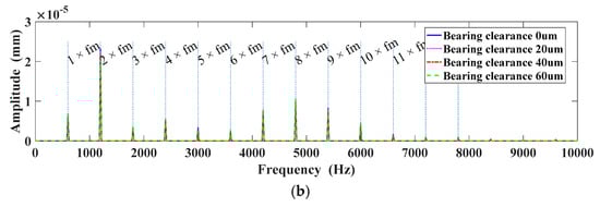 Figure 24a illustrated the time-varying gear meshing force in time domain. It can be obtained from Figure 24b that the amplitudes of eighth to tenth harmonics are much higher than that of other harmonics in the frequency band in which the signals are modulated by the resonance frequency of the gears. To investigate the variation of the gear meshing force, the first ten harmonics of the meshing frequency are illustrated in Figure 25. As can be seen, the amplitude variations of the first four harmonics are nonlinear, which is caused by the nonlinearity effect of the bearing dynamics as presented in many researches. The first order harmonics descend when the bearing clearance increases, and then they increase. The second order, fifth order, eighth order, ninth order and tenth harmonics descend when the bearing clearance increases. However, the third order, fourth order and sixth order harmonics are enlarged with the increase of the bearing clearance.