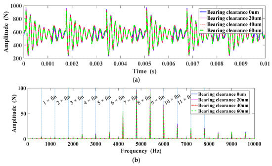 Gear meshing force under different bearing clearance: (a) Gear meshing force; (b) Spectrum of gear meshing force.