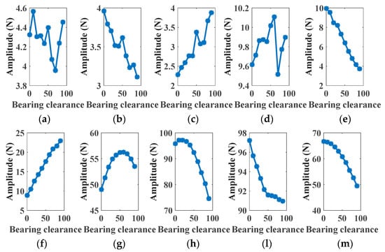 Harmonics of gear meshing force under different bearing clearance: (a) 1 × fm at 40 Nm; (b) 2 × fm at 40 Nm; (c) 3 × fm at 40 Nm; (d) 4 × fm at 40 Nm; (e) 5 × fm at 40 Nm; (f) 6 × fm at 40 Nm; (g) 7 × fm at 40 Nm; (h) 8 × fm at 40 Nm; (l) 9 × fm at 40 Nm; (m) 10 × fm at 40 Nm.