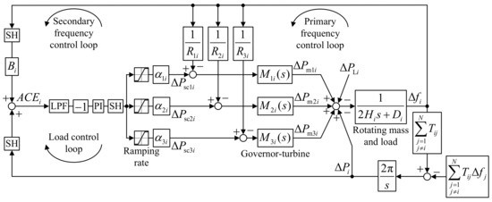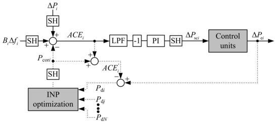 The basic LFC framework of the i-th CA is shown in Figure 1 with solid lines. Here, PI is a proportional-integral controller, whereas a negative control-feedback is included as −1 gain. In addition, LPF denotes low pass filter and SH denotes sample and hold, with typical values of a sampling time between 1 to 5 s. The output of LFC is scheduled control power , which is distributed to the participating control units that change active electric power accordingly. When neglecting the transmission losses, the electrical control power of the i-th CA can be expressed as