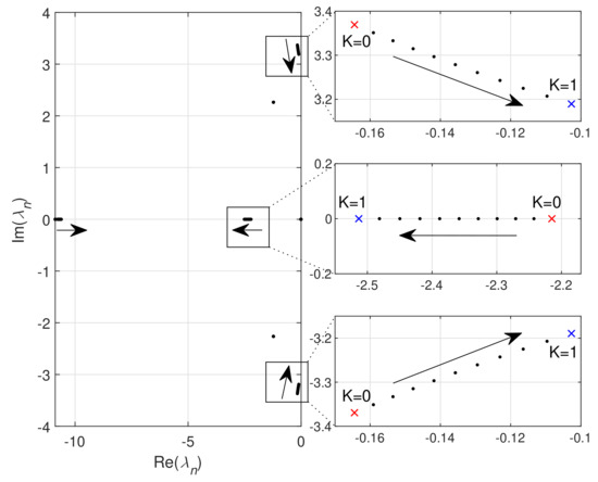 A numerical evaluation was performed, since exact analytical expressions for eigenvalues are complicated. Two identical CAs were assumed, with typical parameters and control settings [10,14]. The only differences were PI controller time constants, which were 60 s and 30 s. ATC factor K was considered as a free parameter. Only INP was considered, since it affects the matrix . The obtained characteristic polynomial is given as