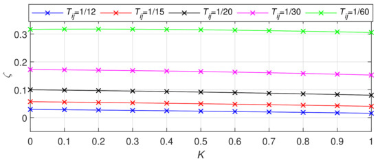 Figure 2 shows the impact of the ATC factor K on eigenvalues of for INP and State 1. A dominant impact of factor K is noticed on three eigenvalues, where one is real and two are complex conjugates, as shown in Figure 2. They are determined by coefficients , and . The most critical are complex conjugate eigenvalues, since increasing the ATC factor K results in decrease of the damping , as given in Table 2 and Figure 3, and has negative impact on the system. The results are given for moderately coupled systems. Additionally, different values of the tie-line parameter were used to show the impact of ATC factor K on damping of dominant eigenvalues of . Figure 3 shows clearly that an increase of results in a decrease of , in addition to the decrease of with an increase of K. Note that the results obtained for State 2 are similar and the differences are seen in Table 1 and Table 2.
