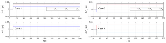 The initial load values were equal to zero in all three connected CAs, as shown in Figure 5. Then, simultaneous step changes of the loads were applied at 10 s.
