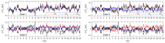 In order to simulate the worst case, the loads of individual CAs were changed simultaneously, although their proportions were maintained through the entire simulation. Note, proportions were set as , and . Additionally, the limit of ATC for power interchange between CAs was disabled () to achieve maximum possible compensation with INP. All possible sign combinations of for numerical simulations of a three-CA testing system are shown in Table 4 in addition to possible INP compensation. Four testing cases were considered; i.e., Cases 1–4, since Cases 5–8 gave the same results, only the resulting signs were opposite. In Case 1, load magnitudes were set in a way that all three CAs were short. In Case 2 CA and CA were short, while CA was long. In Case 3, CA and CA were short, while CA was long. In Case 4, CA was short, while CA and CA were long. Furthermore, full compensation was possible in Cases 2 and 3, due to a higher absolute value of the sum of loads in long CAs in comparison to the absolute value of the load in the short CA. In addition, two types of tests were performed; i.e., step changes of loads and random load fluctuations.