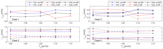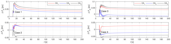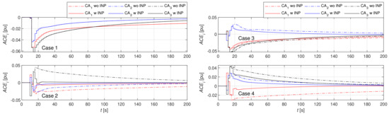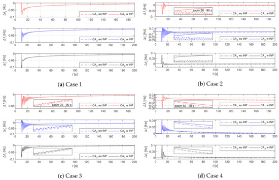 Results are shown in Figure 7, Figure 8, Figure 9, Figure 10, Figure 11, Figure 12 and Figure 13. Frequency deviations in all three CAs are seen in Figure 7a–d after step changes of loads were applied. In Cases 1–3, is negative due to the positive value of total , which is for Case 1, for Case 2 and for Case 3. However, in Case 4, is positive due to the negative value of the total , which is . Note, the first peak of and is negative, due to the positive value of and in Case 2. Accordingly, the first peak of and is negative due to the positive value of and in Case 3, whereas the first peak of is negative, due to the positive value of in Case 4. Initially, primary frequency control decreases in approximately 30 s after the step change of the loads; then, additionally, LFC decreases slowly. Moreover, INP impacts in Cases 2–4, but only after the completion of the primary frequency control, whereas, in Case 1, INP compensation was not possible, as shown in Table 4. It is seen clearly that, in Cases 2 and 3, INP has decreased in all three CAs in comparison to the system without INP. However, in Case 4, was increased due to the negative value of the total , where full compensation was not possible.