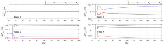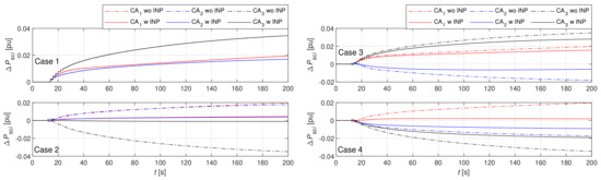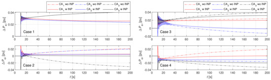The signs of and are opposite in Cases 2–4, as shown in Figure 12 and Figure 13, and a 2 s time delay is seen in due to INP, particularly at the beginning of the transients. Due to the oscillations in , the sign change in is obvious. Consequently, also changes sign, or can even be zero, as seen in Cases 2 and 3. Therefore, these fast changing compensations are not desirable, since they increase variations of at the beginning of the transients, as shown in Figure 8. Note, in Case 1, INP compensation was not possible.