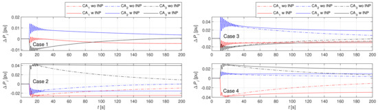 The impact of INP is shown more clearly in Figure 8, Figure 9 and Figure 10. Values of , and decreased with INP in Cases 2–4. Note that INP had an insignificant impact on the dynamic of primary frequency control, as seen from , where, approximately 20 s after the step change of the load, the differences between the systems with and without INP occurred. However, INP obviously increased in Cases 2–4, due to additional tie-line power flow, as seen in Figure 11. Note, in Case 1, INP compensation was not possible.