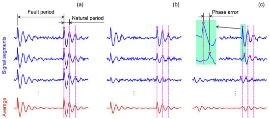 The separated LAIT segments are not rigorously synchronous as speed fluctuations as well as roller slippages happen inevitably, and both of them can cause phase errors [,]. Ensemble averaging of the separated LAIT segments with phase errors can cause great loss of diagnostic information. Typically, the impact transients caused by defects have a waveform of damping oscillation, which lasts several periods of the natural resonance frequency as shown in Figure 1a. Phase errors in the time scale of 1/4 natural frequency period can cause great information loss, as shown in Figure 1c. In addition, the natural frequency period is typically smaller than 0.001 s as the natural frequency of a bearing is as high as several thousand Hz. Thus, phase errors of 2.5 × 10−4 s are not negligible.