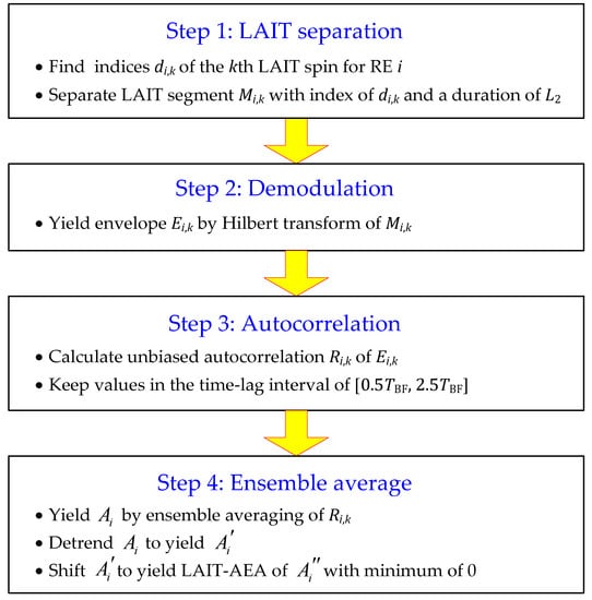 Step 1: LAIT separation. The LAIT segments for RE i, can be separated according to the kinematics of the bearing operation using the method as explained in Reference []. The time sequence of the spin phases, , are firstly constructed for each RE i. Then, by applying the condition of Equation (1) to the time sequence of , the indices of the LAIT spins, , can be identified. Particularly, if the jth spin is the kth LAIT spin, then, , where is the spin period and is the sampling frequency.